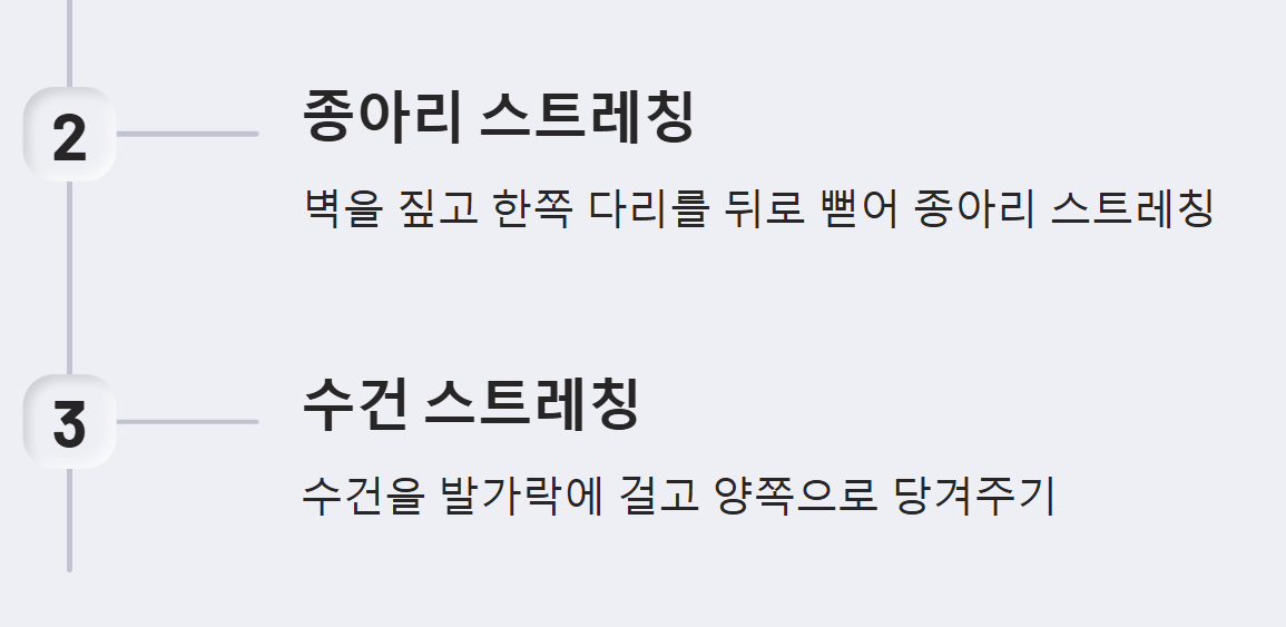 - 뒷발의 발꿈치를 바닥에 붙이고 무릎을 곧게 펴 종아리 뒤쪽이 당기도록 늘립니다.