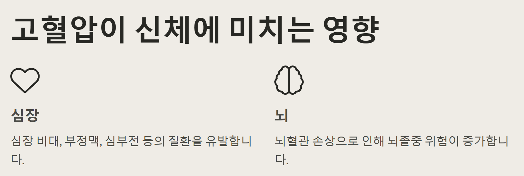 - 심장: 고혈압은 심장을 더 열심히 일하게 만들어 심장 비대, 부정맥, 심부전 등을 유발할 수 있습니다.