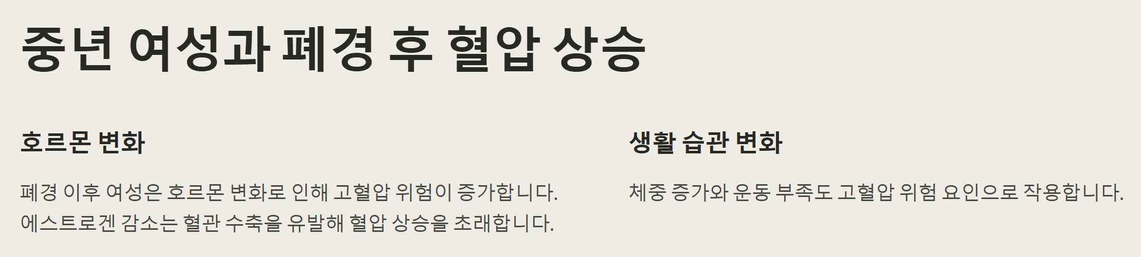 중년 여성의 경우 폐경 이후 호르몬 변화로 인해 고혈압 위험이 높아집니다. 여성 호르몬인 에스트로겐은 혈관을 확장시키는 효과가 있지만, 폐경 후 에스트로겐 감소로 혈관이 수축되어 혈압이 상승할 수 있습니다. 또한, 폐경 후 체중 증가, 운동 부족 등으로 인해 고혈압 위험이 더욱 높아질 수 있습니다.