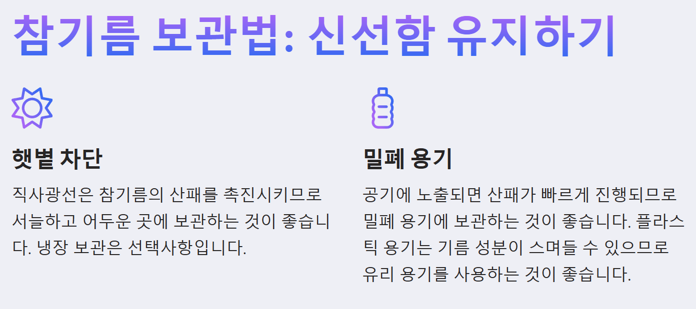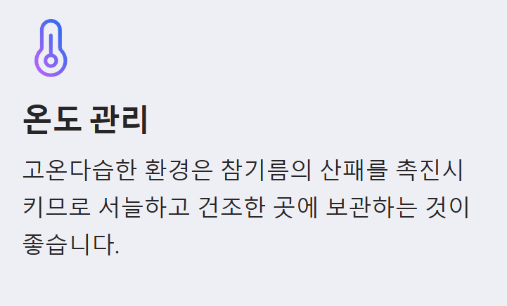 - 온도: 냉장 보관 시에는 참기름 특유의 풍미가 저하될 수 있으므로, 상온 보관을 권장합니다.