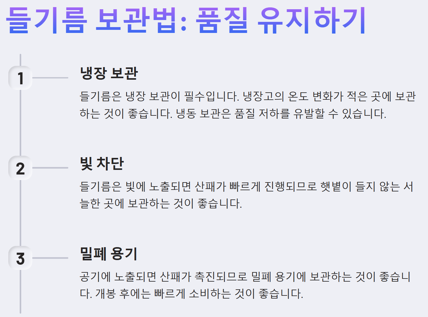 들기름은 오메가-3 지방산이 풍부하여 건강에 좋지만, 산화되기 쉬운 성질을 가지고 있습니다. 따라서 반드시 냉장 보관해야 합니다.
