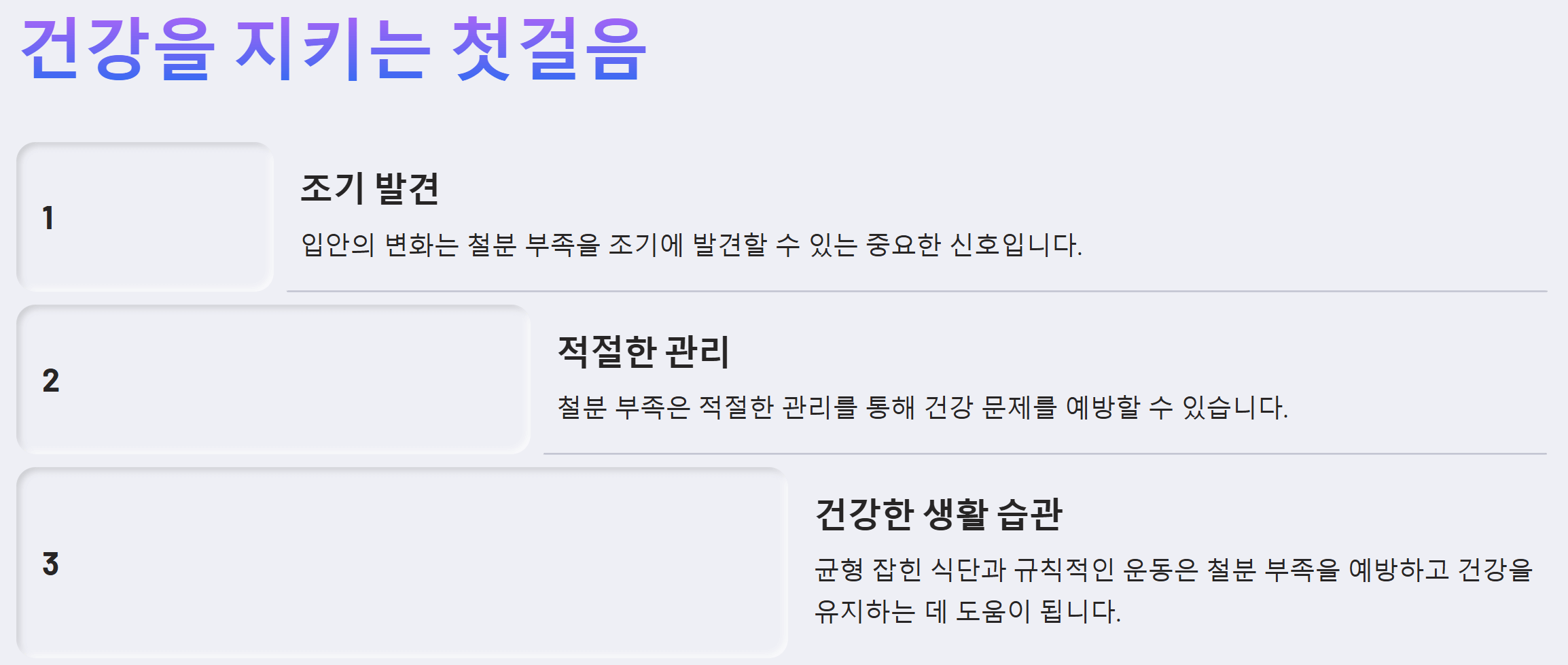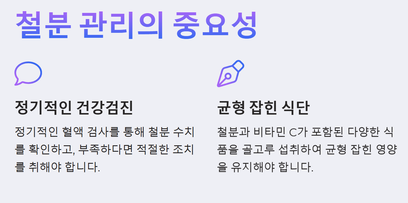 - 정기적인 건강검진: 혈액 검사를 통해 철분 수치를 확인하고, 필요한 경우 적절한 치료를 받는 것이 중요합니다.