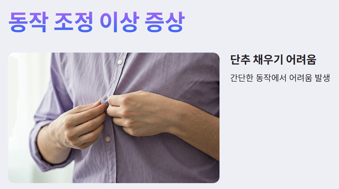 - 기본적인 동작에 어려움: 초로기 치매 환자 중 일부는 옷을 입을 때 단추를 채우는 것과 같은 간단한 동작에서 어려움을 겪을 수 있습니다. 이는 신경학적인 문제로 발생하는 것으로, 일상생활의 불편을 초래합니다.