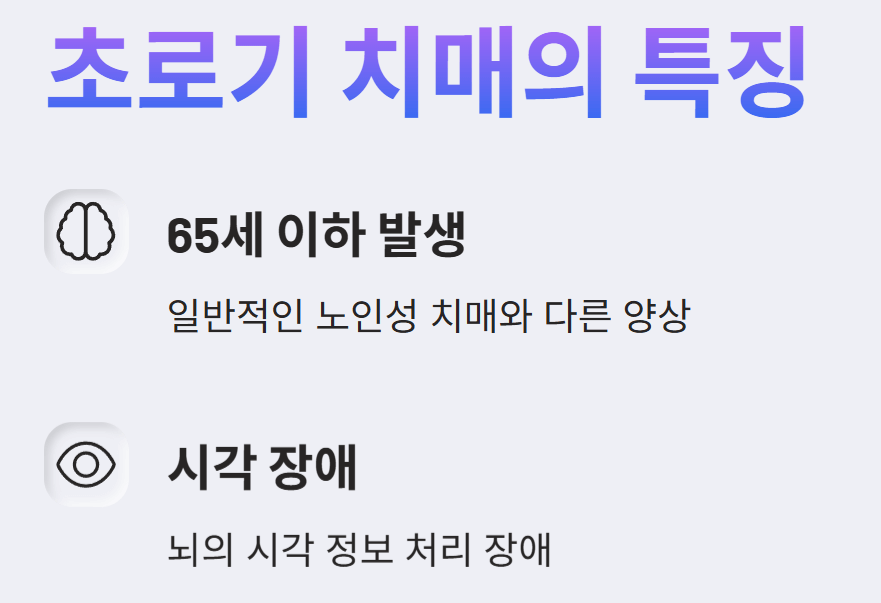 - 뇌의 시각 처리 장애: 초로기 치매는 뇌가 시각 정보를 제대로 인식하지 못하는 증상을 보일 수 있습니다. 이로 인해 시각적 혼란이 발생하며 일상적인 활동에 어려움을 겪을 수 있습니다.