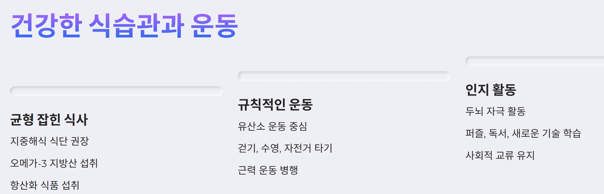 - 체력 유지: 일주일에 3일 이상 30분 이상의 운동을 하면 뇌 건강을 지키는 데 도움이 됩니다. 유산소 운동이 특히 유익하며, 운동은 뇌의 기능을 활성화시키는 데 중요한 역할을 합니다.