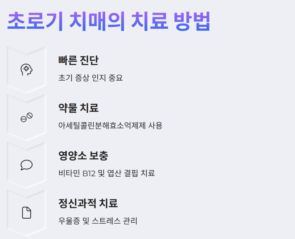 - 정신적 원인 치료: 우울증이나 스트레스 등의 정신적 원인으로 인해 초로기 치매가 발생할 수 있습니다. 이 경우 정신과적 치료를 병행하는 것이 필요합니다.