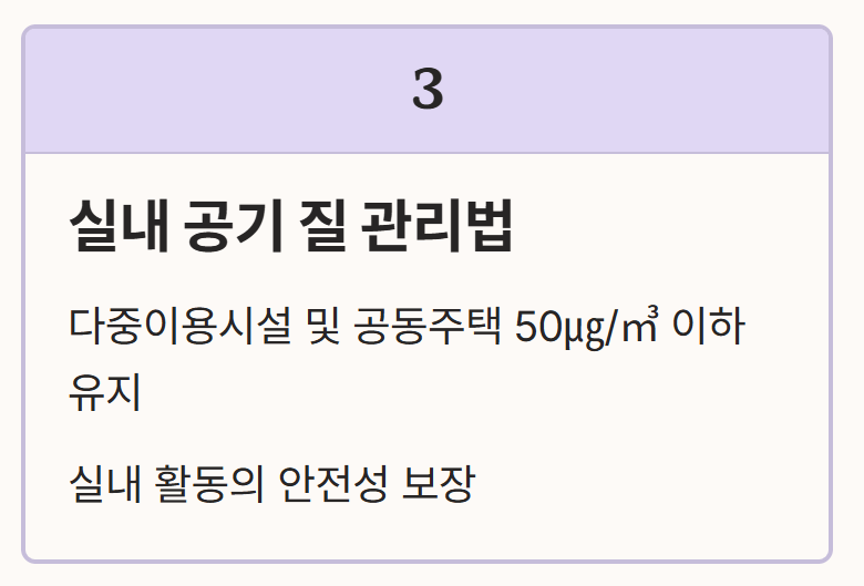 - 실내 공기 질 관리법: 다중이용시설 및 공동주택의 경우 50㎍/㎥ 이하를 유지하도록 규정하여 실내 활동의 안전성을 보장하고 있습니다.
