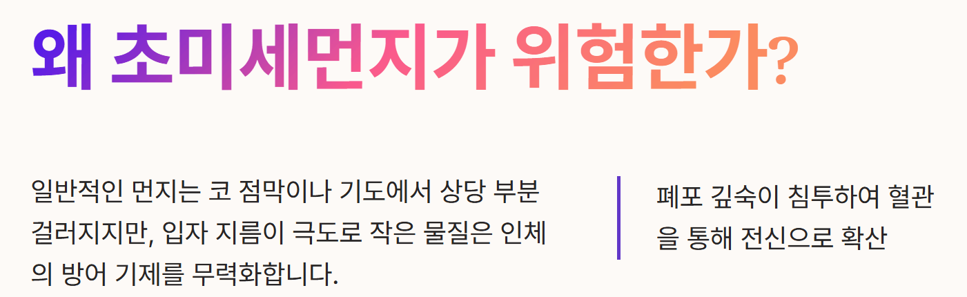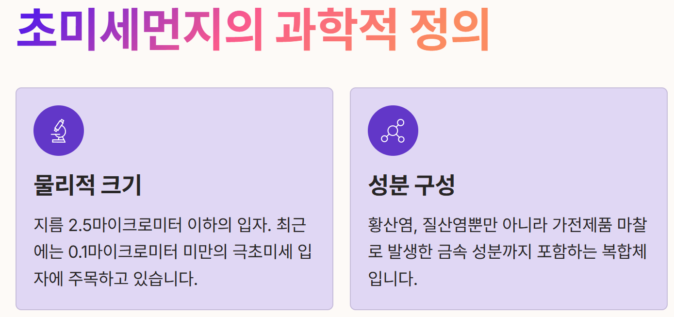 - 물리적 크기: 지름이 2.5마이크로미터 이하인 입자를 의미하며, 최근에는 0.1마이크로미터 미만의 극초미세 입자에 대한 위험성도 강조되고 있습니다.