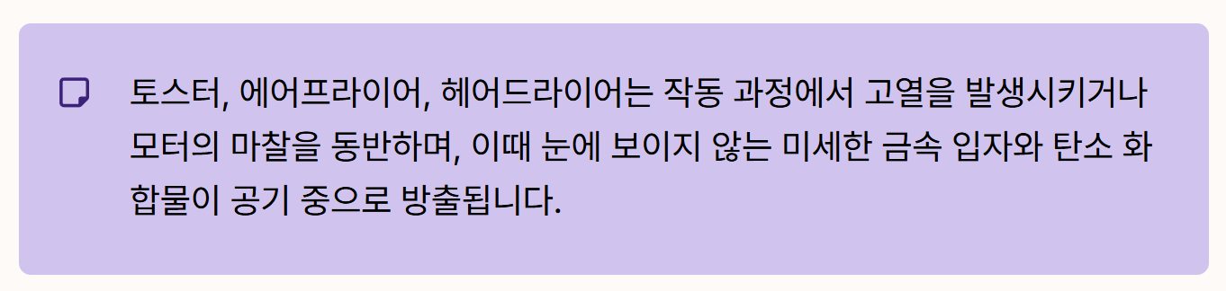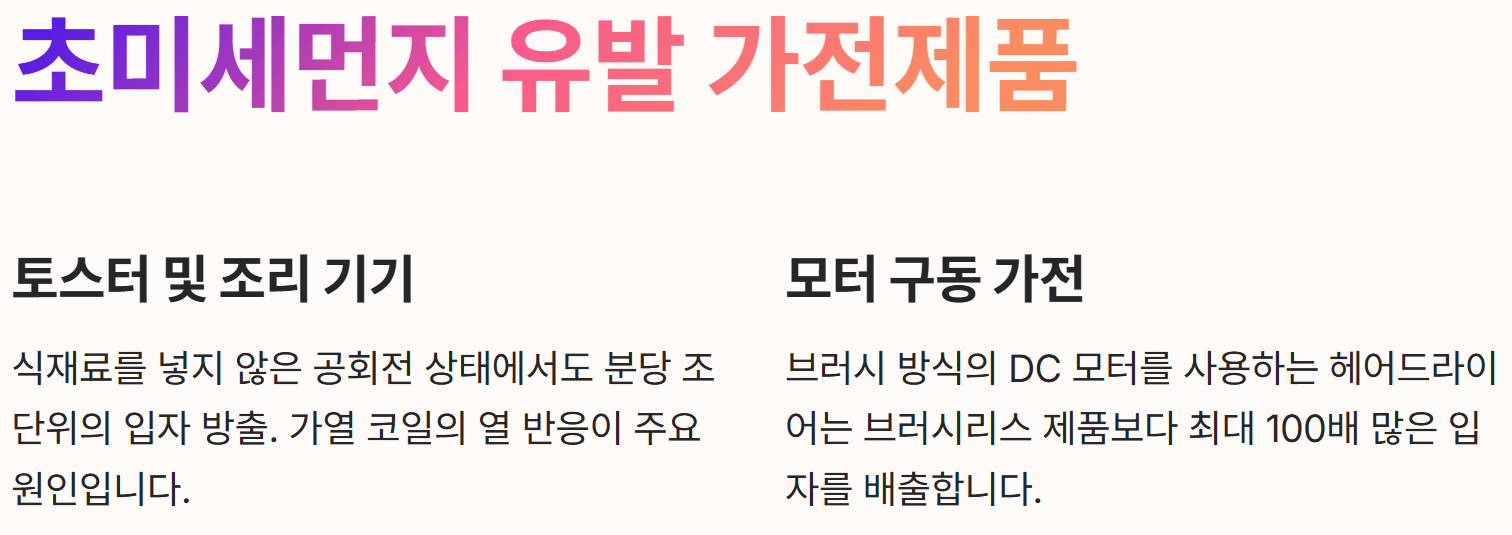 - 모터 구동 가전: 브러시 방식의 DC 모터를 사용하는 헤어드라이어는 모터 마찰 과정에서 브러시리스 제품보다 최대 100배 많은 입자를 배출합니다.