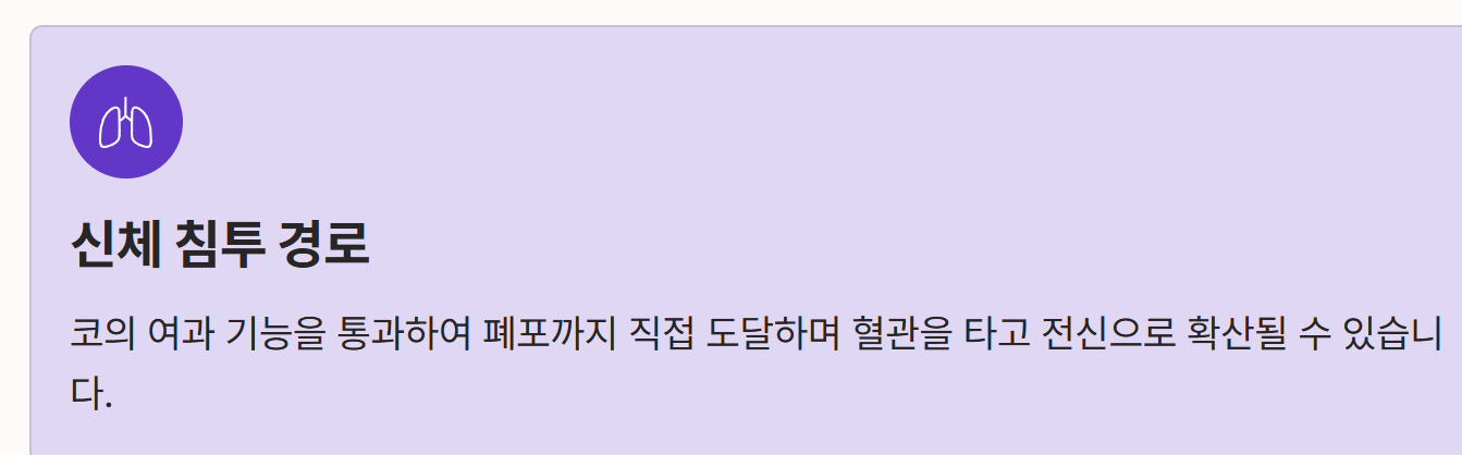 - 신체 침투 경로: 호흡 시 코의 여과 기능을 통과하여 기관지를 지나 폐포까지 직접 도달하며 혈관을 타고 전신으로 확산될 가능성이 존재합니다.