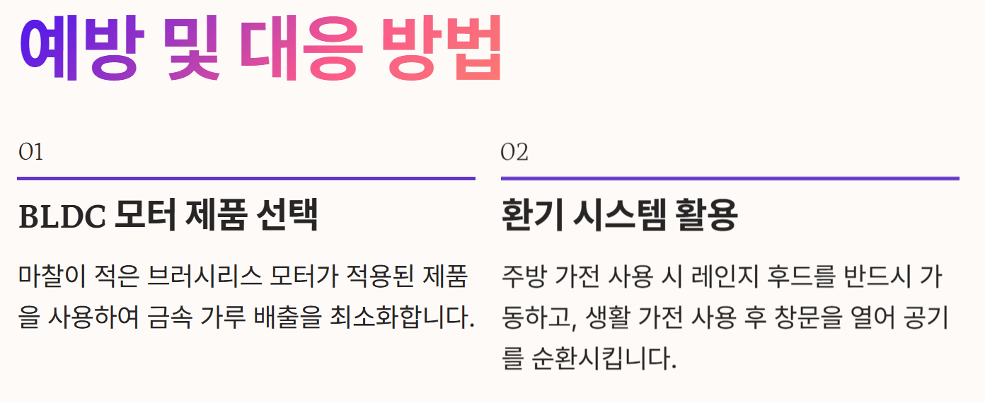 - 환기 시스템 활용: 주방 가전 사용 시에는 레인지 후드를 반드시 가동하고, 생활 가전 사용 후에는 창문을 열어 공기를 순환시켜야 합니다.