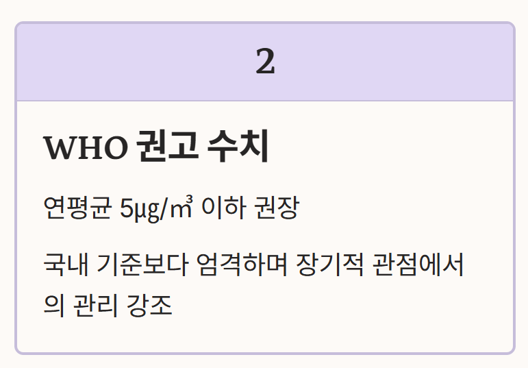 - WHO 권고 수치: 세계보건기구는 국내 기준보다 엄격한 연평균 5㎍/㎥ 이하를 권장하며 장기적인 관점에서의 관리를 강조합니다.