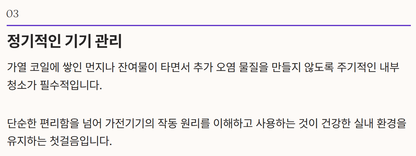 - 정기적인 기기 관리: 가열 코일에 쌓인 먼지나 잔여물이 타면서 추가적인 오염 물질을 만들지 않도록 주기적인 내부 청소가 필수적입니다.