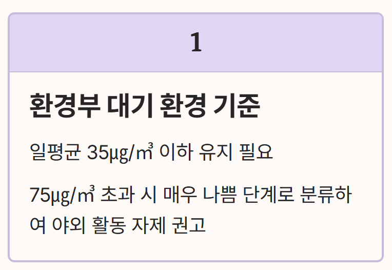 - 환경부 대기 환경 기준: 일평균 35㎍/㎥ 이하를 유지해야 하며, 75㎍/㎥를 초과할 경우 매우 나쁨 단계로 분류하여 야외 활동 자제를 권고합니다.