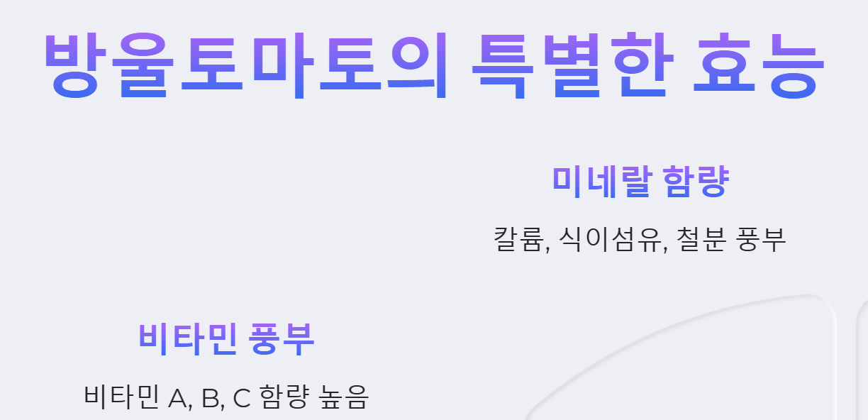 - 방울토마토: 비타민 A 함량이 일반 토마토보다 약 2배 높습니다. 비타민 B군, 비타민 C 또한 1.5~2배 더 풍부하게 함유하고 있습니다.