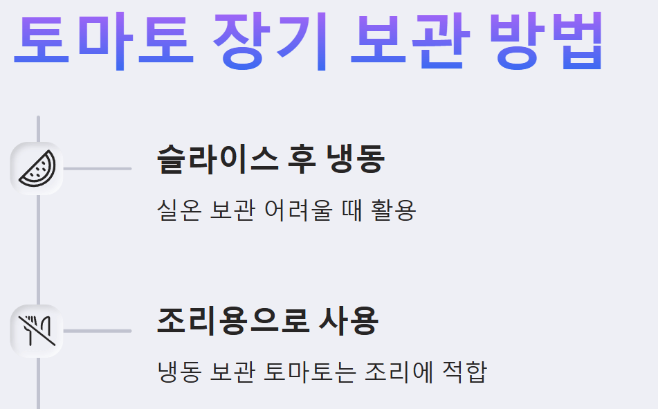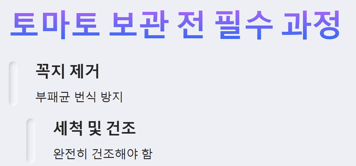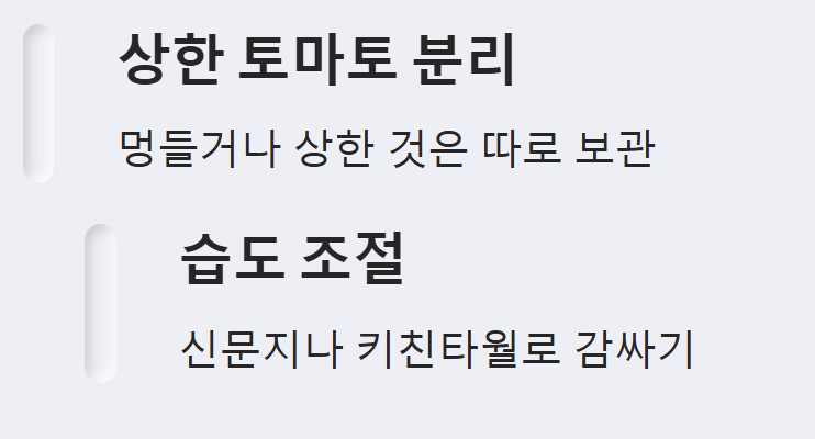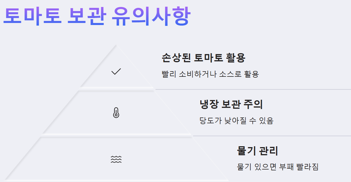 ※ 주의사항: 멍들거나 상처가 있는 토마토는 다른 토마토까지 상하게 할 수 있으므로, 발견 즉시 분리하여 보관하거나 먼저 섭취하는 것이 좋습니다.
