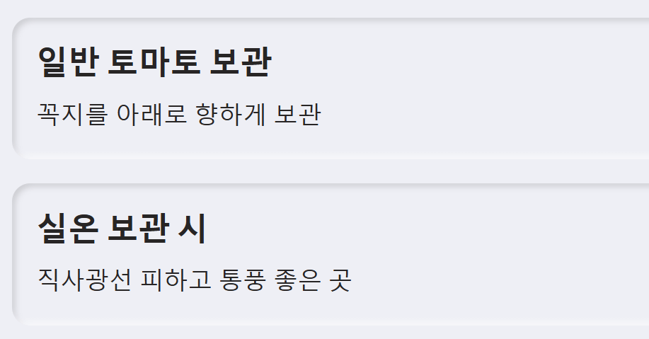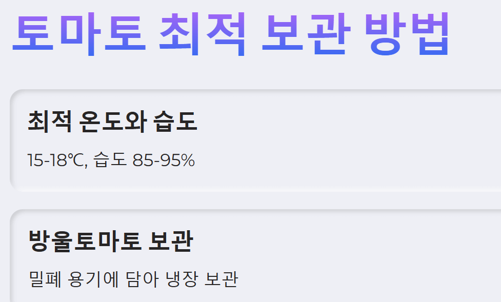 농촌진흥청은 토마토 보관 시 최적 온도는 15~18℃, 습도는 85~95%라고 밝혔습니다. 너무 낮거나 높은 온도, 건조한 환경은 토마토의 신선도를 떨어뜨릴 수 있습니다.