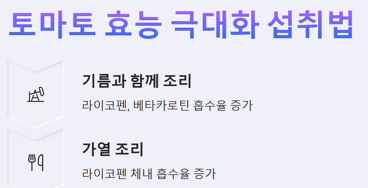 - 가열하여 섭취: 토마토를 가열하면 세포벽이 파괴되어 라이코펜이 더욱 쉽게 용출됩니다. 따라서 생으로 먹는 것보다 익혀 먹는 것이 라이코펜 흡수율을 높이는 좋은 방법입니다.