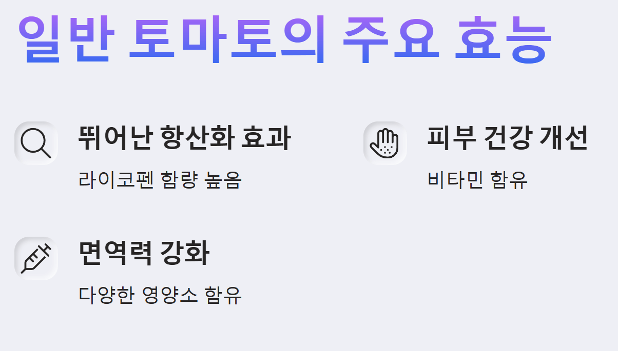 - 일반 토마토: 대표적인 항산화 성분인 라이코펜 함량이 높습니다. 라이코펜은 강력한 항산화 작용으로 세포 손상을 막고, 다양한 질병 예방에 도움을 줄 수 있습니다.