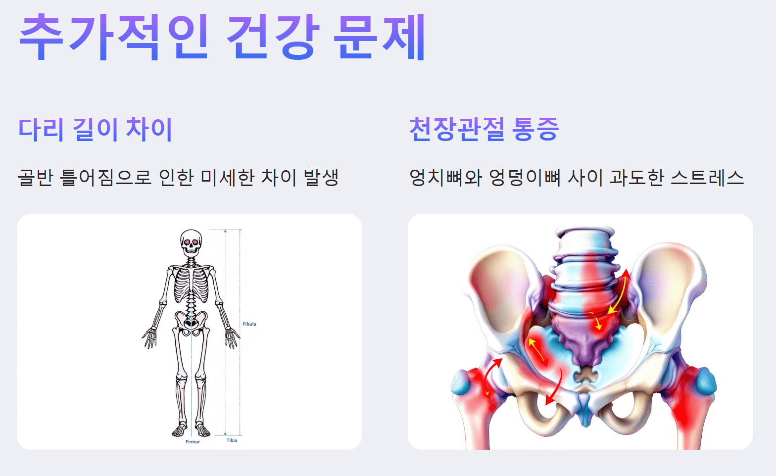 - 다리 길이 차이 및 천장관절 통증: 골반이 틀어지면 다리 길이에 미세한 차이가 발생할 수 있으며, 엉치뼈와 엉덩이뼈 사이의 천장관절에 과도한 스트레스를 주어 통증을 유발할 수 있습니다.