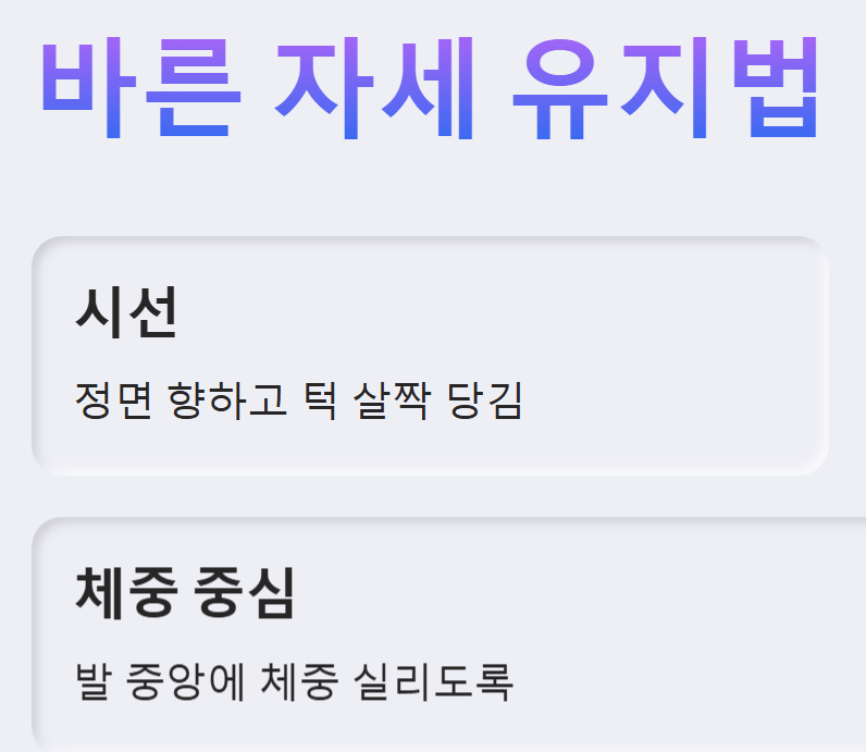 - 시선: 정면을 향하고 턱을 살짝 당겨 목과 척추가 일직선이 되도록 합니다.
