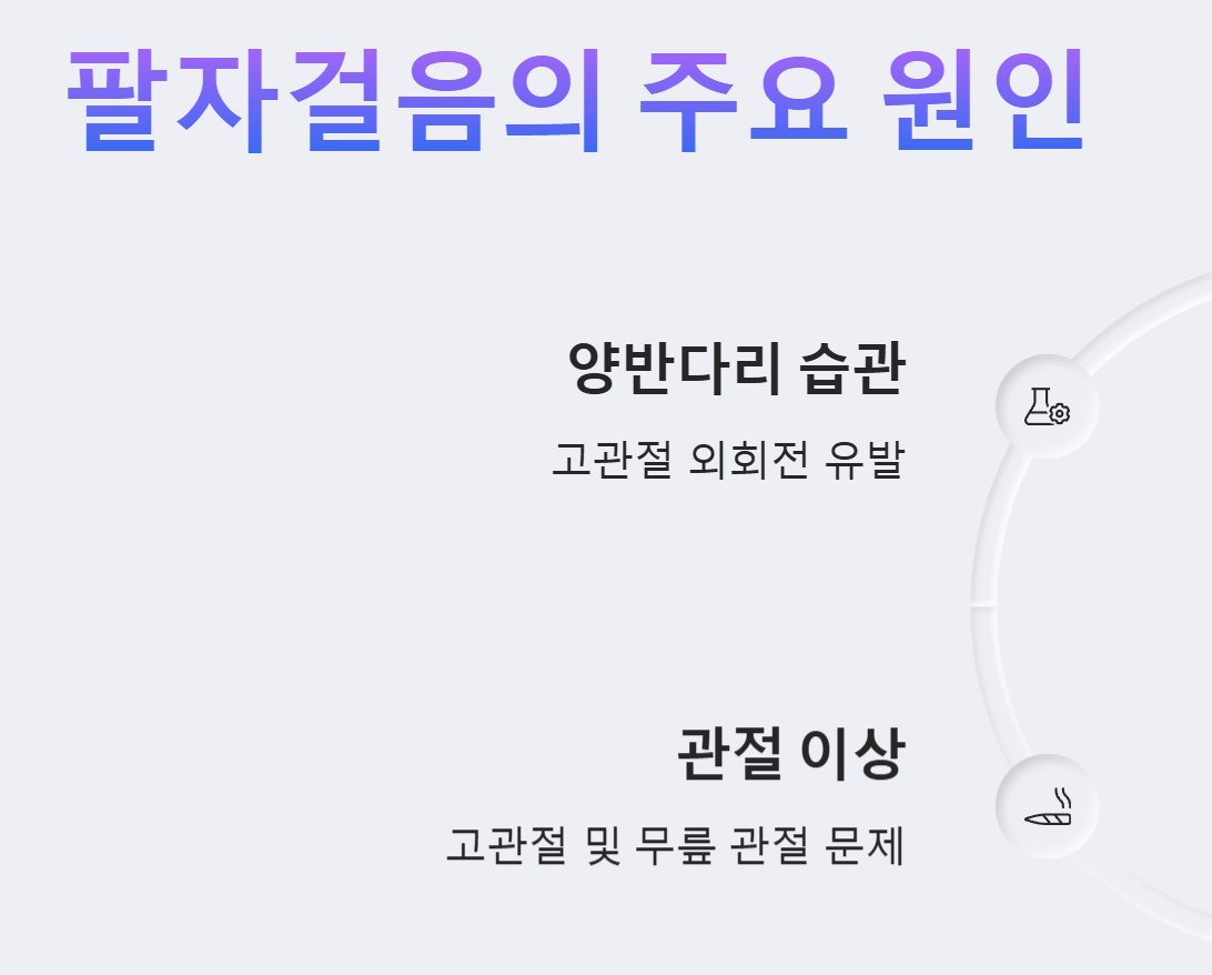 - 다리 꼬는 습관: 골반의 불균형을 초래하여 보행 시 발이 바깥으로 향하게 만들 수 있습니다.
