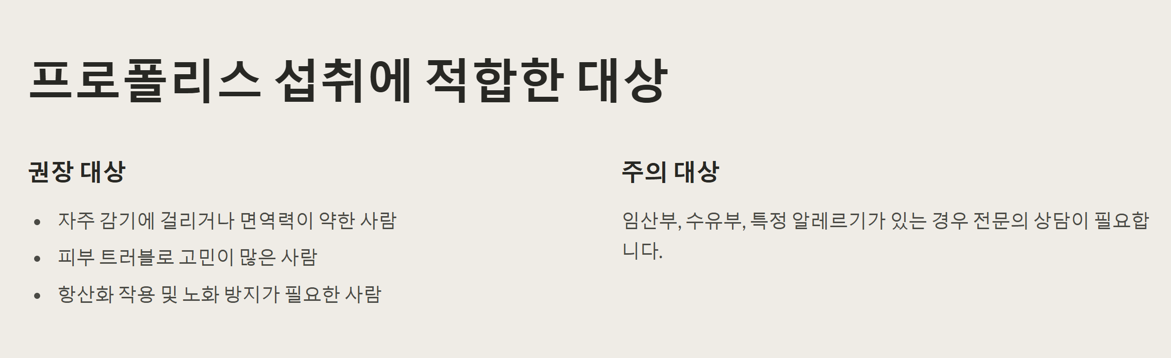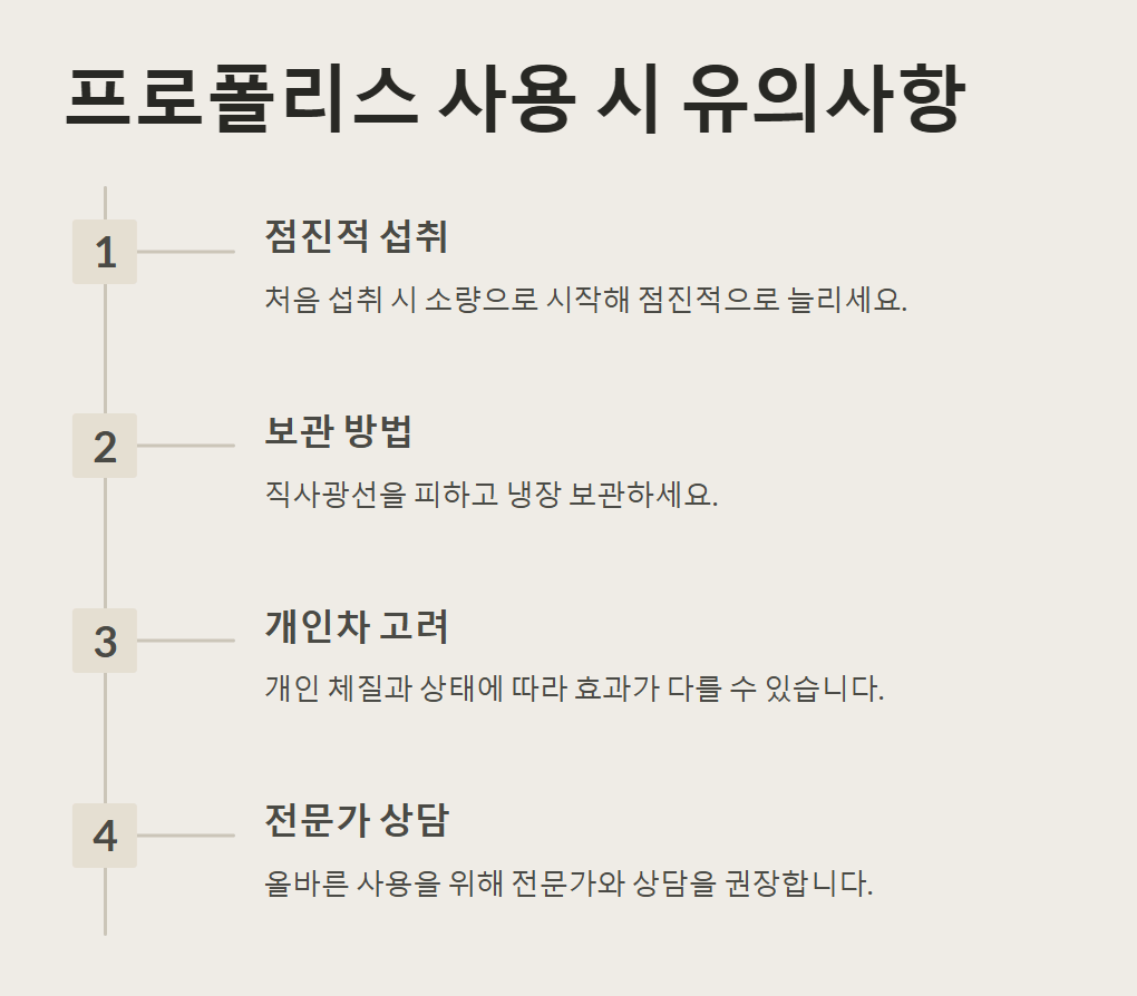 - 모유 수유: 프로폴리스 성분이 모유를 통해 아기에게 전달될 수 있으므로 수유부 역시 전문가와 상담 후 섭취해야 합니다.
