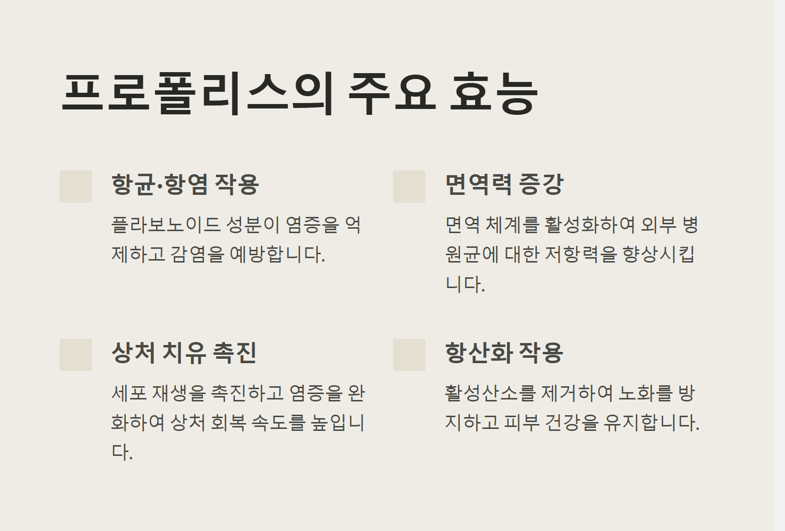 - 항산화 작용: 프로폴리스의 강력한 항산화 작용은 노화를 촉진하는 활성산소를 제거하여 피부 노화를 방지하고, 젊음을 유지하는 데 도움을 줍니다.