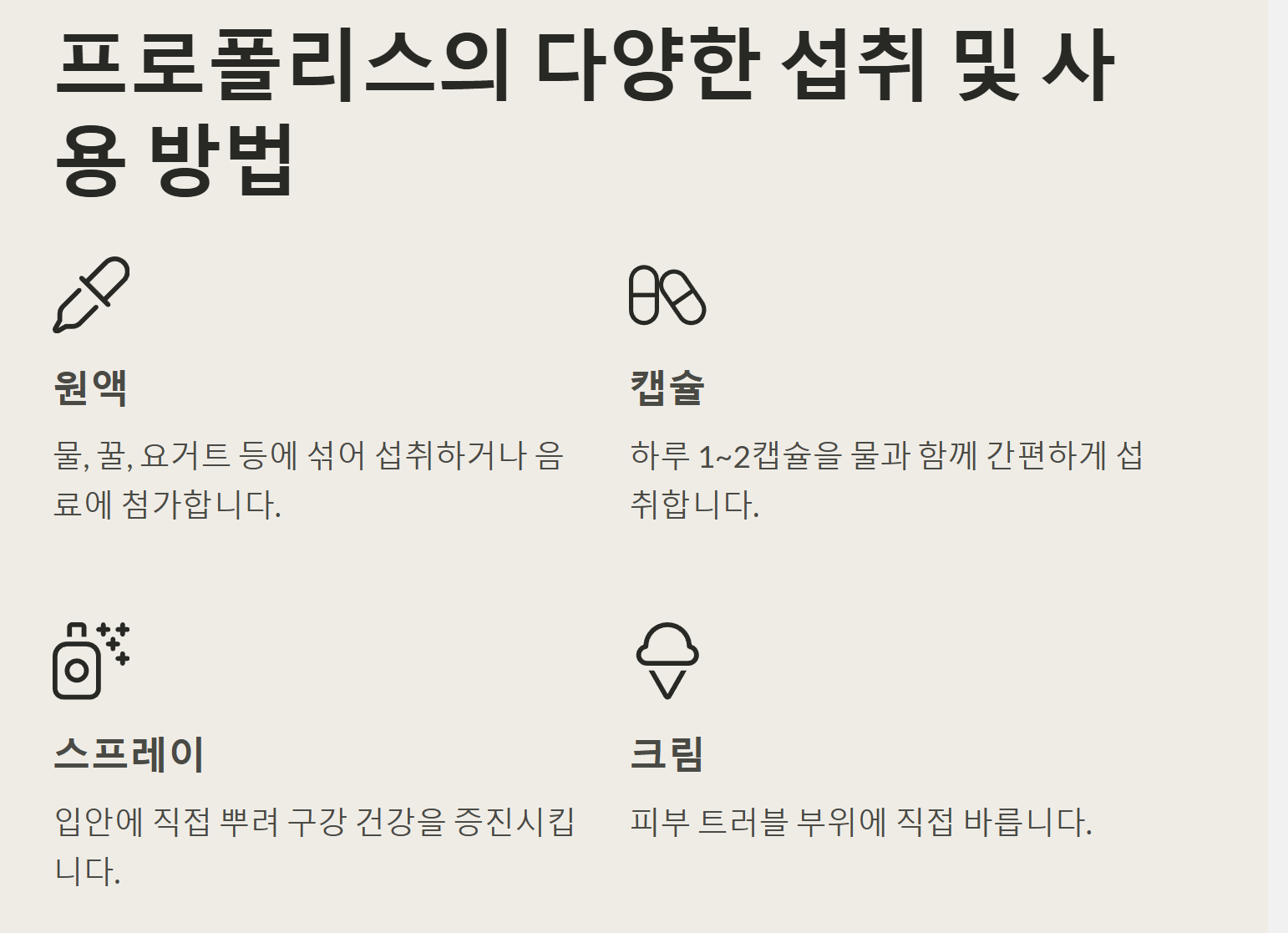 프로폴리스는 다양한 형태로 섭취할 수 있습니다.