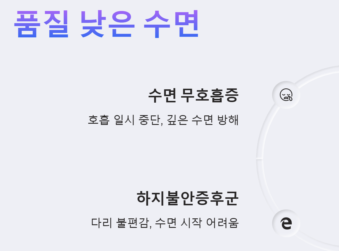 - 하지불안증후군: 잠들기 전 다리에 불편한 느낌이 들어 다리를 움직이게 되는 질환으로, 수면 시작을 어렵게 하고 수면의 질을 저하시킵니다.