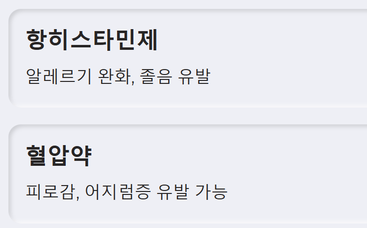 - 항히스타민제: 알레르기 증상 완화에 사용되지만, 졸음을 유발하여 낮 동안 집중력을 저하시킬 수 있습니다.
