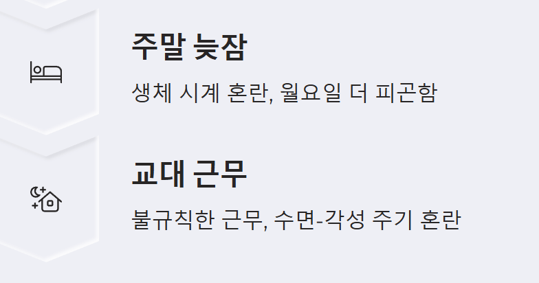 - 주말 늦잠: 평일에 부족한 잠을 보충하려는 행동이지만, 생체 시계를 늦춰 월요일 아침 더욱 피곤함을 느끼게 합니다.