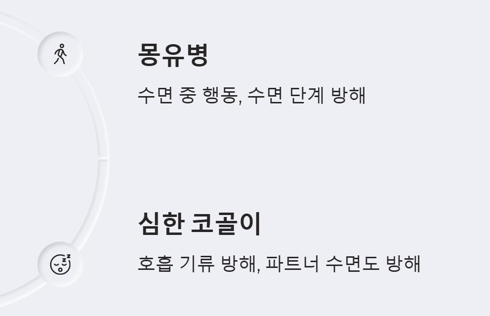 - 심한 코골이: 수면 중 호흡 기류의 방해로 인해 발생하는 소음으로, 본인뿐만 아니라 수면 파트너의 수면까지 방해할 수 있습니다.