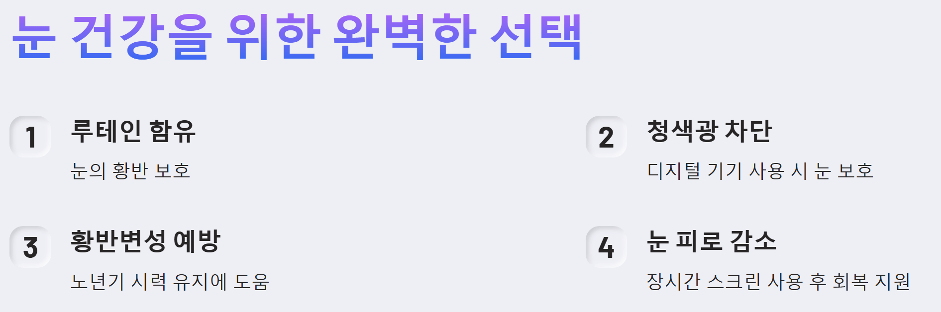 - 시력 저하 예방: 꾸준한 항산화 성분 섭취는 시력 저하를 예방하고 선명한 시야를 유지하는 데 도움을 줍니다.