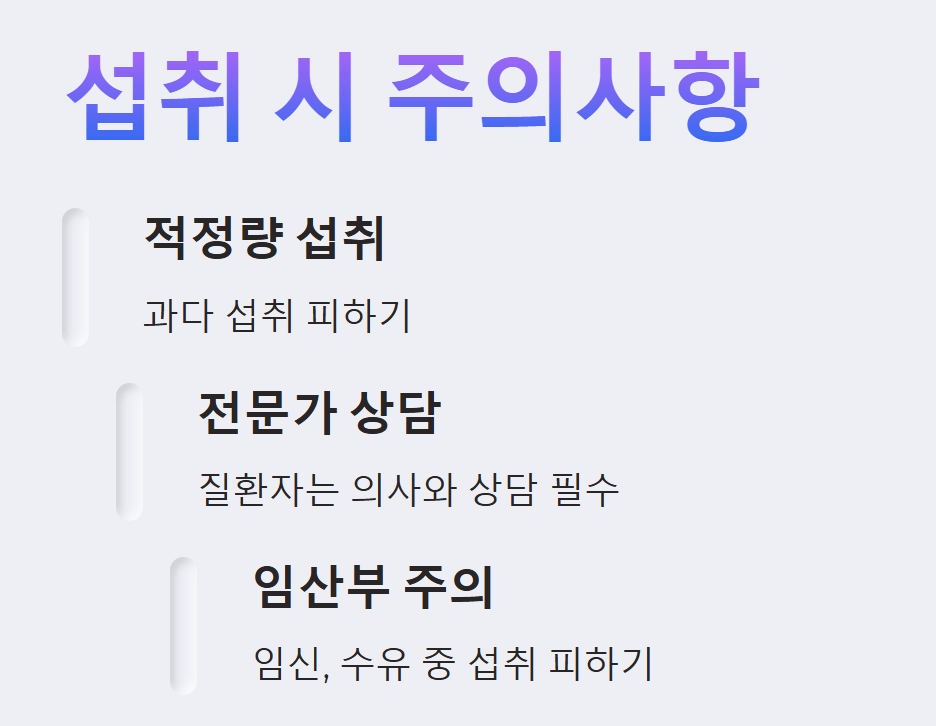 - 과다 섭취 시 부작용: 한 번에 너무 많은 양을 섭취할 경우 위장 장애, 설사, 복통, 메스꺼움 등의 증상이 나타날 수 있으므로 적정량을 지키는 것이 중요합니다.