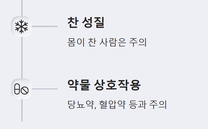 - 약물 상호작용: 당뇨약, 저혈압약, 면역억제제, 항혈소판제, 항응고제와 같은 특정 약물들은 혈당 변화나 혈압 변화를 야기 하거나 면역 체계에 영향을 줄 수 있으므로 섭취 전 전문가와 상담하고 주의하는 것이 좋습니다..