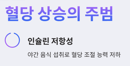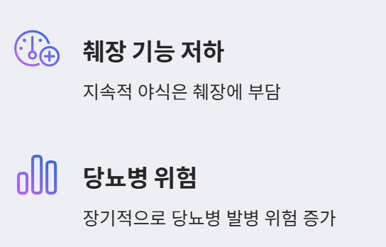 - 췌장 기능 저하: 지속적인 야식은 인슐린을 분비하는 췌장에 부담을 주어 장기적으로는 당뇨병 발병 위험을 크게 높이는 원인이 됩니다.