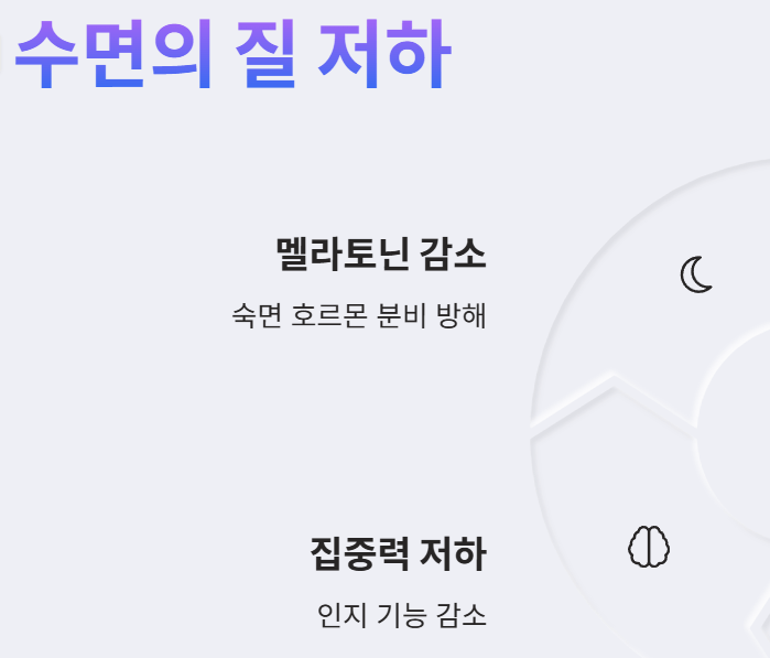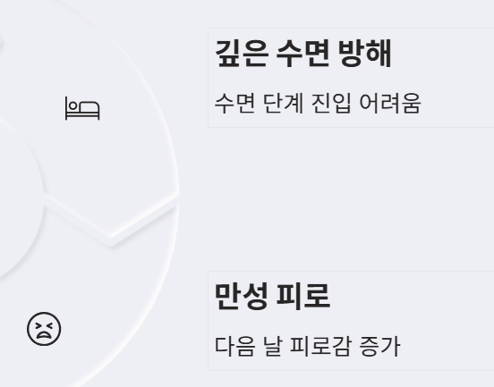 - 수면의 질 저하: 숙면을 돕는 멜라토닌 분비가 감소하면서 깊은 잠에 들기 어려워지고, 이는 다음 날 만성 피로와 집중력 저하로 이어질 수 있습니다.