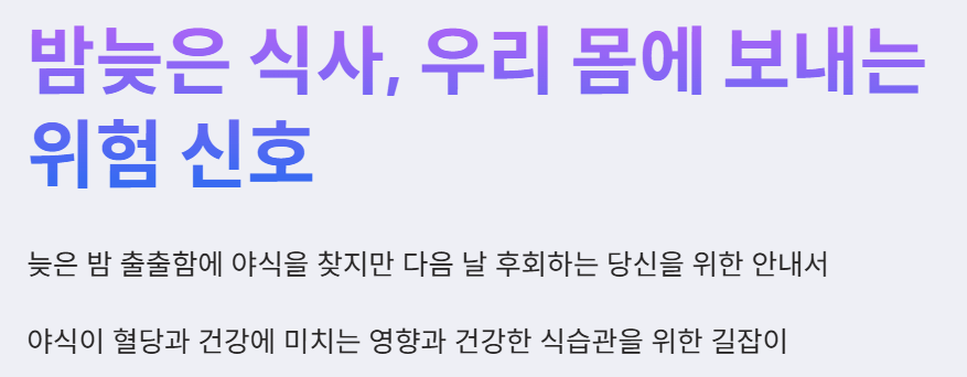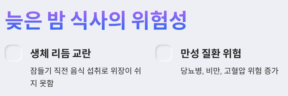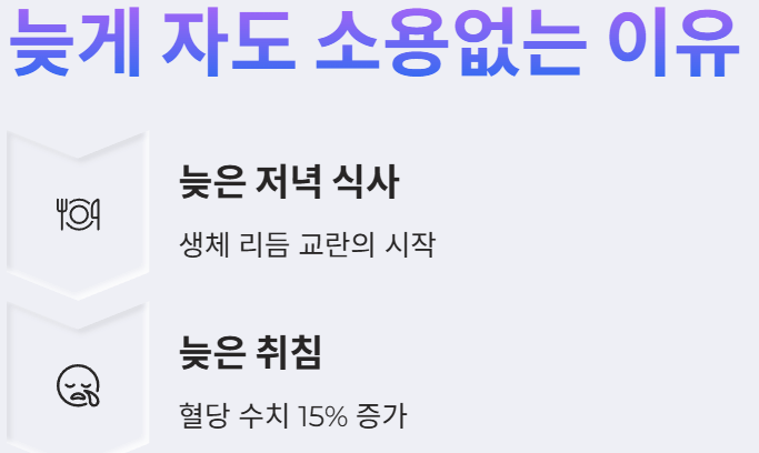 - 핵심 원인: 이는 야식 후 늦은 취침이 해결책이 될 수 없으며, 늦은 시간에 식사하는 행위 자체가 우리 몸의 일주기 리듬을 교란하여 혈당 조절 시스템에 악영향을 미친다는 것을 증명합니다.