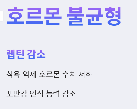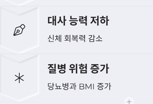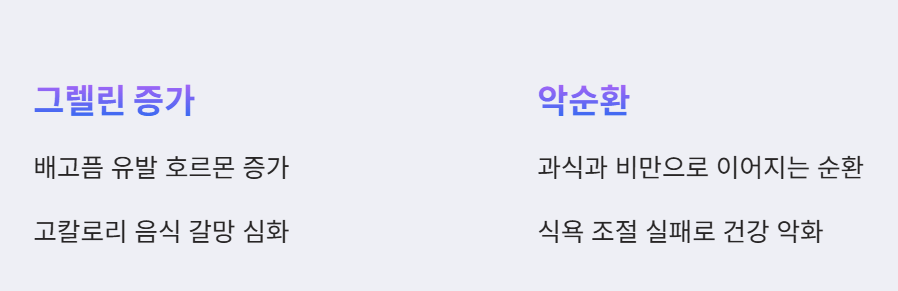 - 호르몬 불균형: 식욕을 억제하는 호르몬인 렙틴 수치는 낮아지고, 배고픔을 느끼게 하는 그렐린 수치는 높아져 과식과 비만의 악순환을 유발합니다.