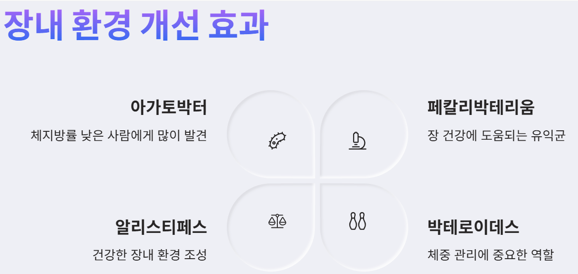 - 체중 관리 도움: 특정 유익균의 증가는 지방 축적을 억제하고 에너지 소비를 촉진하여 체중 관리에 긍정적인 영향을 미칠 수 있습니다.