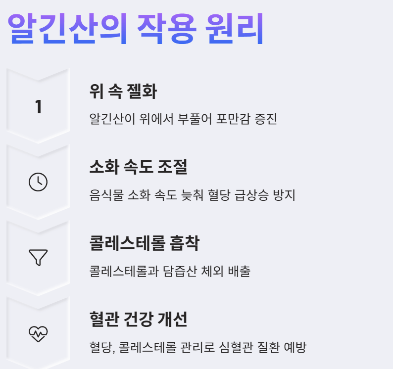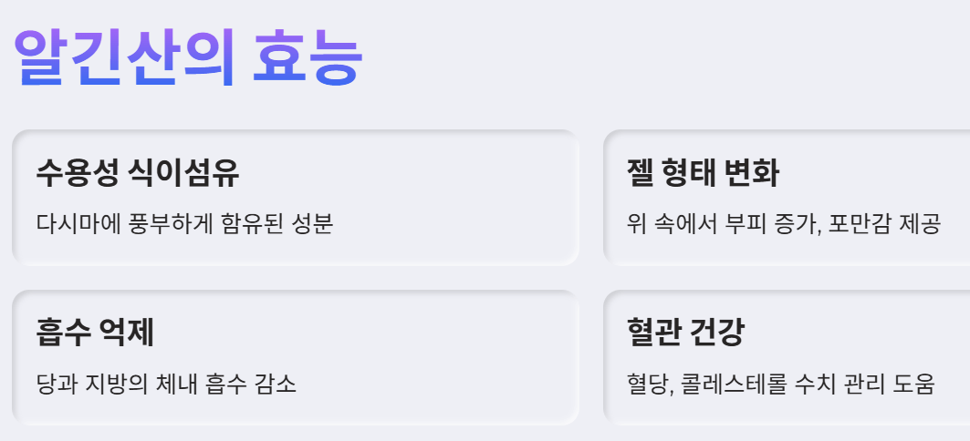- 포만감 증진: 알긴산은 위에서 부풀어 올라 포만감을 느끼게 하여 식사량 조절에 도움을 줄 수 있습니다.