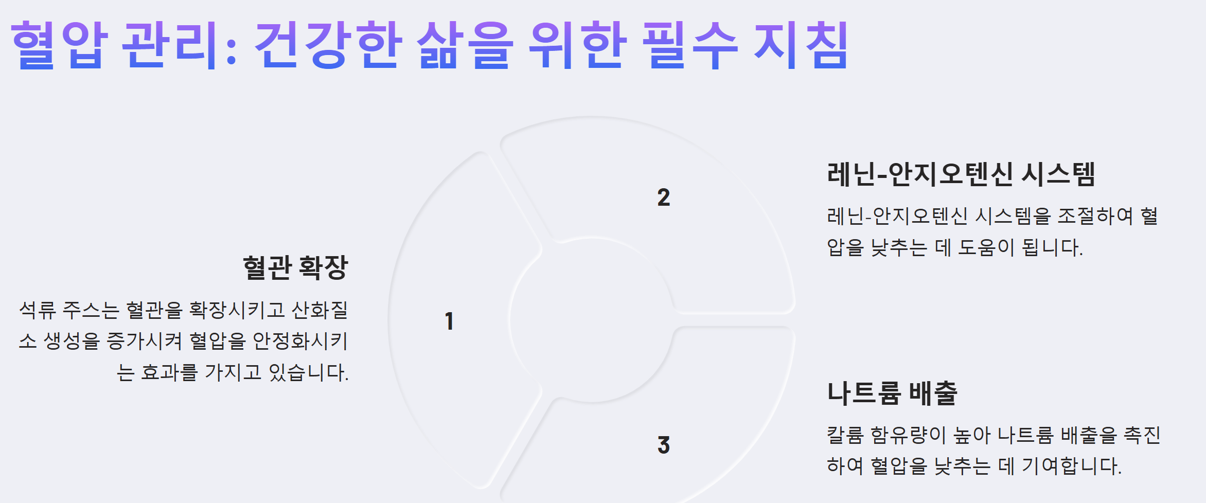 석류는 혈압을 조절하는 데 중요한 역할을 하는 레닌-안지오텐신 시스템에 긍정적인 영향을 미칩니다. 석류 주스는 안지오텐신 전환 효소(ACE)의 활성을 억제하여 혈압 상승을 막는 효과가 있습니다. 석류에는 비타민 C, 비타민 K, 칼륨 등 다양한 영양소가 풍부하게 함유되어 있습니다. 이러한 영양소들은 혈관 건강을 유지하고 혈압을 조절하는 데 도움을 줍니다. 특히 칼륨은 나트륨 배출을 촉진하여 혈압을 낮추는 효과가 있습니다.