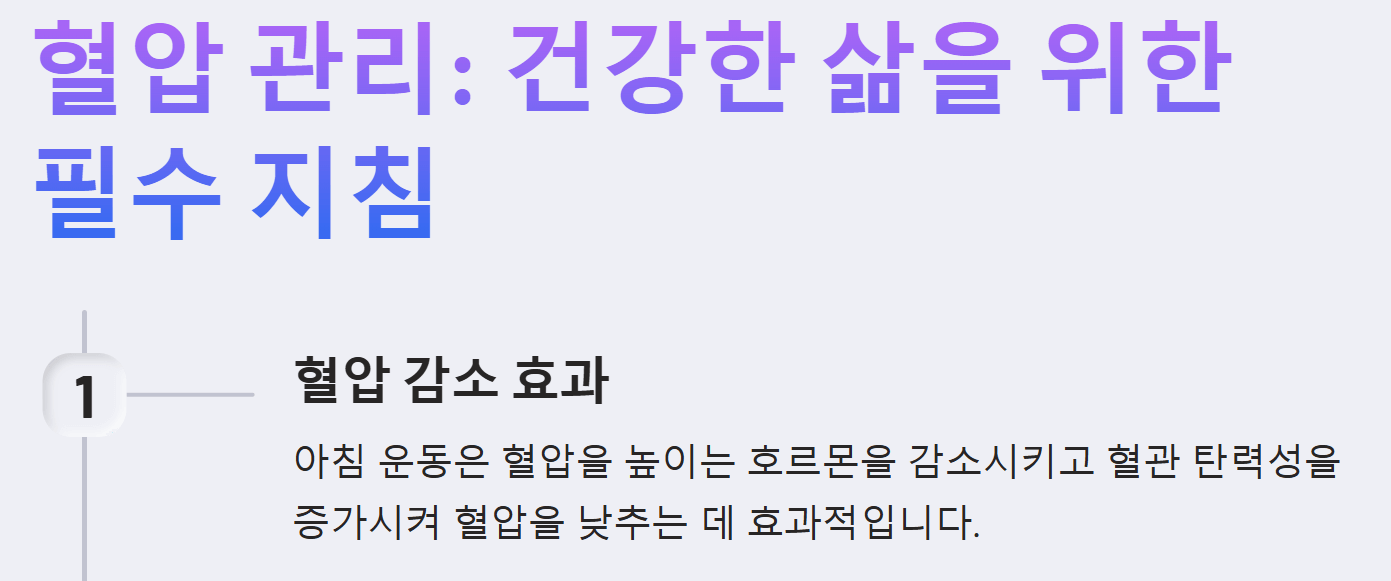 우리 몸은 잠자는 동안 혈압이 가장 낮아졌다가 활동을 시작하면서 서서히 올라갑니다. 아침에 적절한 운동을 하면 혈압 상승을 완만하게 조절하고, 혈관 건강을 개선하는 데 도움을 줄 수 있습니다. 또한, 아침 운동은 신진대사를 활발하게 하고, 하루 종일 에너지를 효율적으로 사용할 수 있도록 도와줍니다.