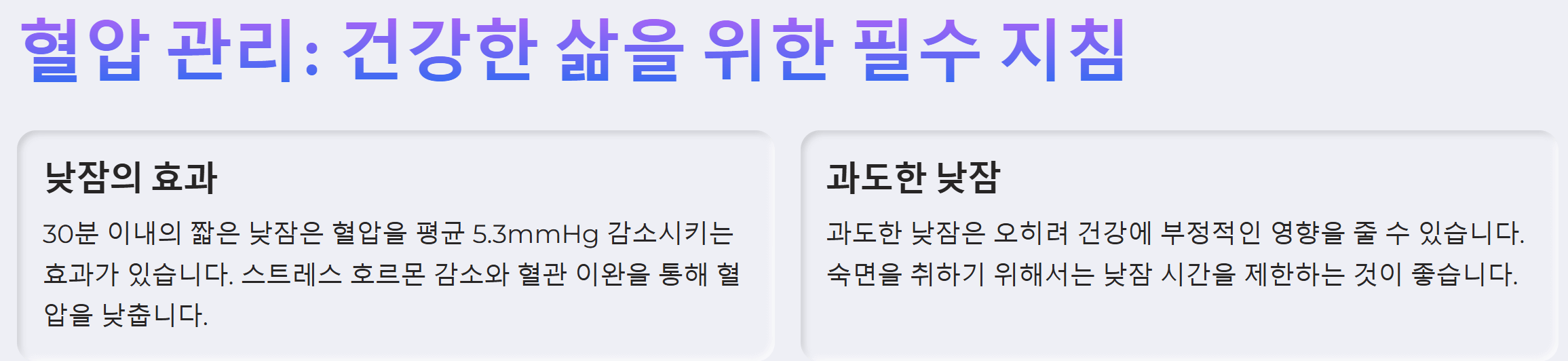 하지만 지나치게 긴 낮잠은 오히려 건강에 해로울 수 있습니다. 30분 이내의 짧은 낮잠이 혈압 관리에 가장 효과적입니다. 낮잠을 통해 혈압을 안정시키고 활력을 되찾으세요.