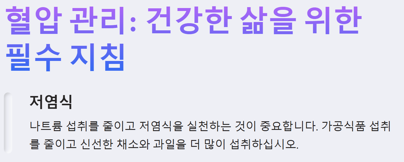 - 저염 식단: 나트륨 섭취를 줄이는 것은 혈압 관리에 가장 중요한 요소 중 하나입니다.