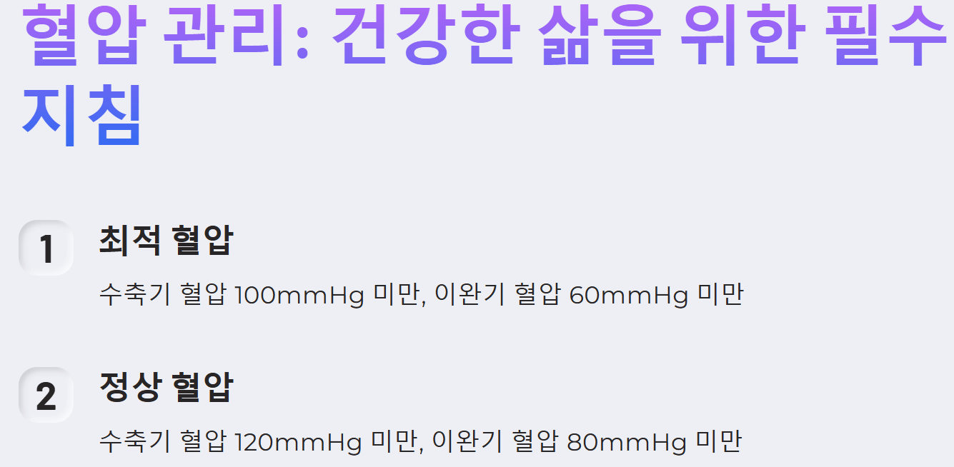 - 최적 혈압: 수축기 혈압 100mmHg 미만, 이완기 혈압 60mmHg 미만
