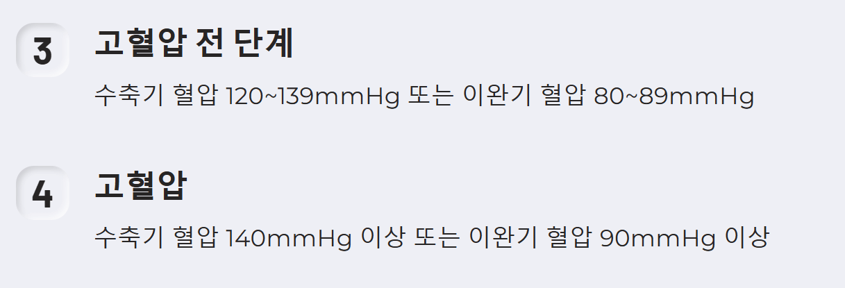 - 고혈압 전 단계: 수축기 혈압 120~139mmHg 또는 이완기 혈압 80~89mmHg