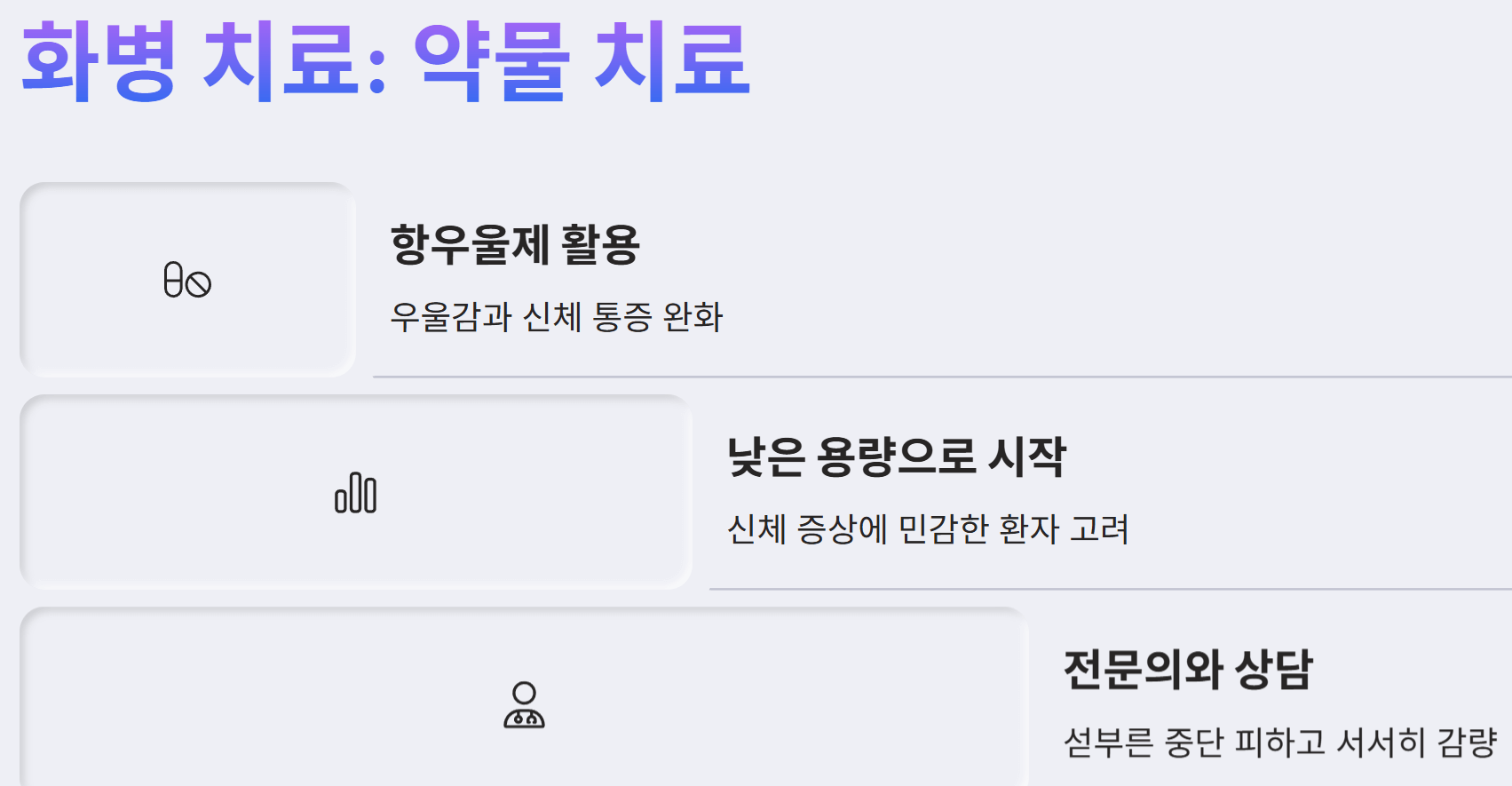 - 약물 치료: 일반적으로 우울증 치료에 사용되는 항우울제가 화병에도 효과적으로 사용될 수 있습니다. 항우울제는 단순히 우울감뿐만 아니라, 신체 통증이나 불안 증상을 완화시키는 데 도움을 줄 수 있습니다. 특히 우울 증상이 뚜렷한 경우 적극적인 약물 치료가 필요합니다. 다만, 신체 증상에 민감한 환자의 경우 낮은 용량으로 시작하여 천천히 증량하는 것이 중요하며, 증상이 호전되었다고 섣불리 약을 중단하기보다는 전문의와 상담 후 서서히 감량해야 합니다.