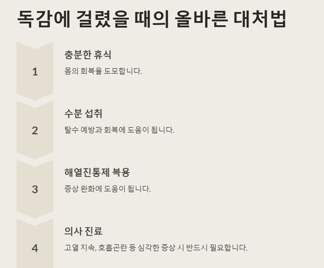 만약 독감에 걸렸다면, 우선 충분한 휴식을 취하고 수분을 충분히 섭취해야 합니다. 해열진통제를 복용하여 열을 내리고 통증을 완화할 수 있지만, 의사의 진료를 받고 적절한 치료를 받는 것이 중요합니다. 특히 고열이 지속되거나 호흡곤란, 가슴 통증 등의 증상이 나타나면 즉시 병원을 방문해야 합니다.